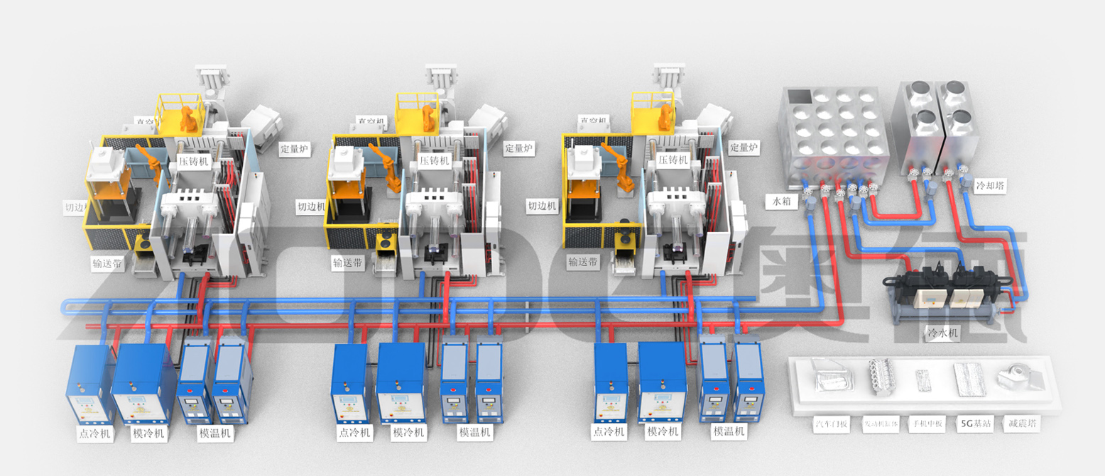 2.压铸温控岛一站式交付:模温机,点冷机,模冷机,冷水机,纯水机,模具管道清洗机.
